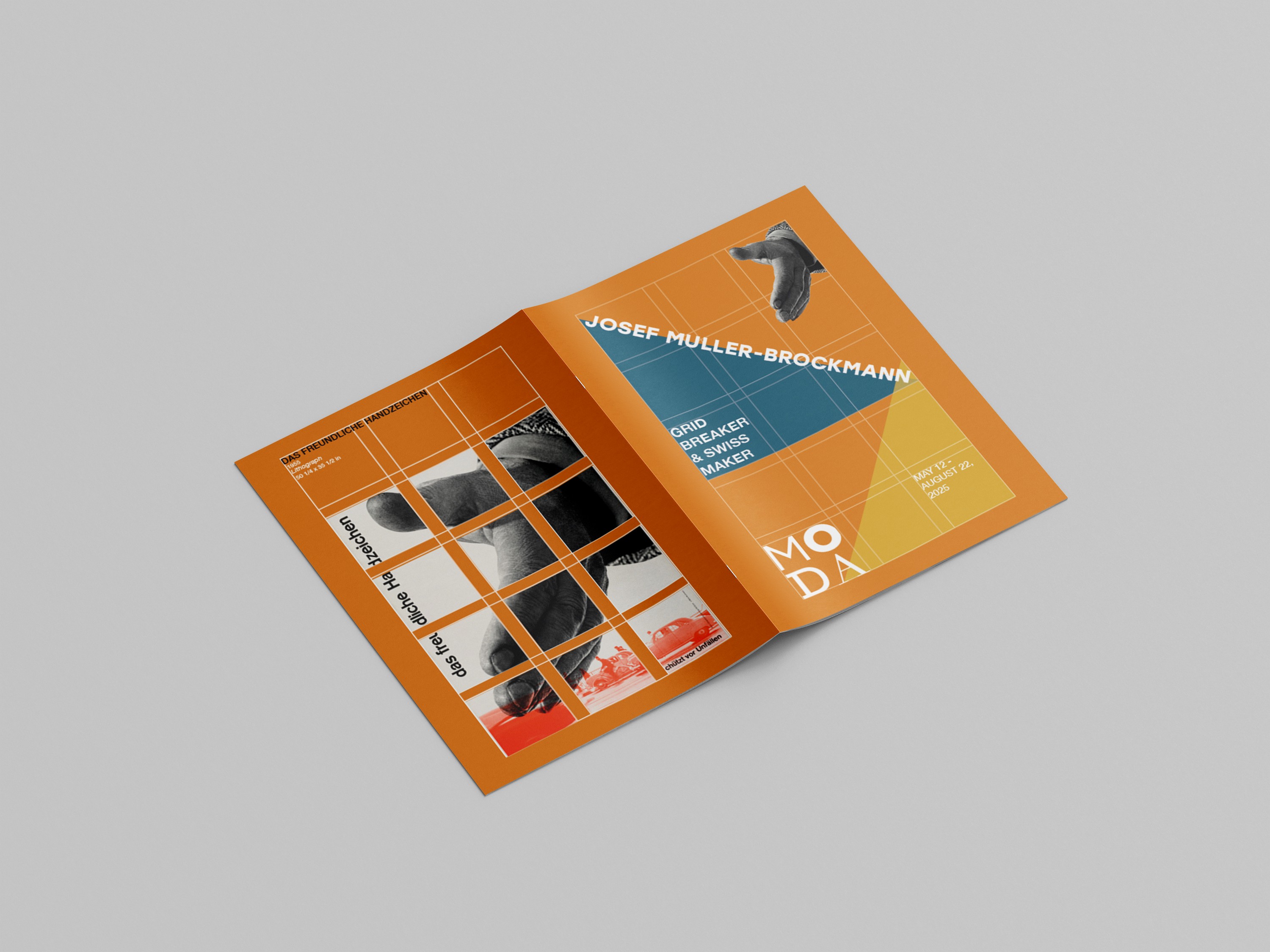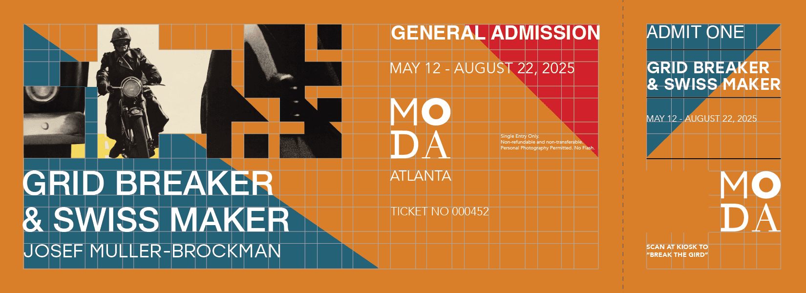 I decided to create a interactive experience where people could come and play with the grid themselves and have a personalized poster image that they could take with them. I wanted them to know what to expect as soon as they got the ticket and be excited. The color palette is inspired by the orange cover of Muller's "Grid Systems" book and common colors he's used in his own work.